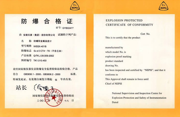防爆雙金屬溫度計領取了由國家級儀器儀表防爆安全監(jiān)督檢驗站出具的防爆合格證