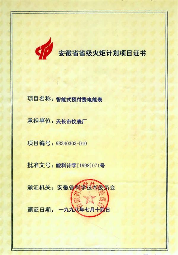 智能式預(yù)付費(fèi)電表獲安徽省省級火炬計劃項(xiàng)目證書