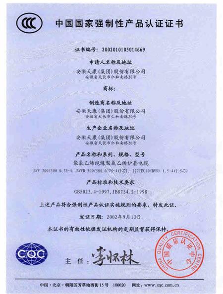 聚氯乙烯絕緣聚氯乙烯護(hù)套電纜被中國質(zhì)量認(rèn)證中心評為中國國家強(qiáng)制生產(chǎn)產(chǎn)品認(rèn)證證書