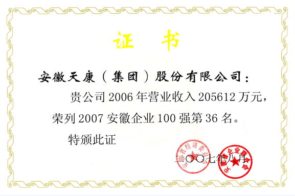 2007年度安徽省百?gòu)?qiáng)企業(yè)第36名