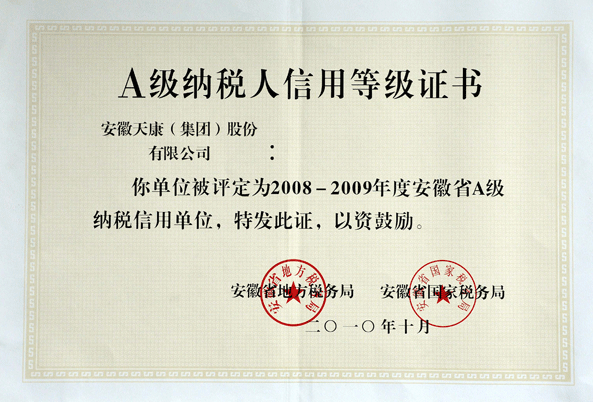 2008-2009年度A級(jí)納稅人信用等級(jí)證書(shū)