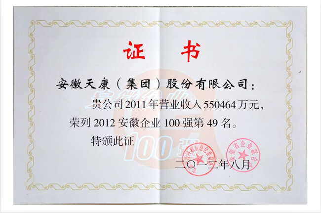 2012安徽百強(qiáng)第49名榮譽(yù)證書